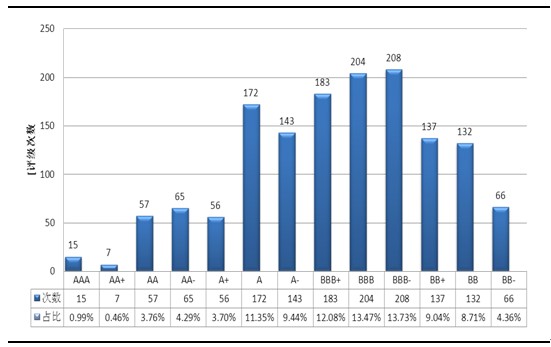 对东方金诚数据库中1515家次借款企业评级的信用评级情况进行统计分析,具体评级级别分布如图1所示。