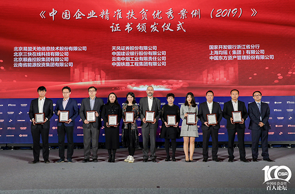 2020年11月13日,由国务院扶贫办社会扶贫司指导、中国社会责任百人论坛主办的“中国企业精准扶贫优秀案例(2019)”发布会在京举行。国务院扶贫办社会扶贫司司长曲天军做主旨发言,全国工商联办公厅副主任、一级巡视员姜建静,国务院国资委科技创新和社会责任局社会责任处处长张晓松从不同层面介绍了经验做法,对包括中国东方在内的中央企业、地方国企、民企和外企,在精准扶贫方面取得的各项成果予以高度肯定。