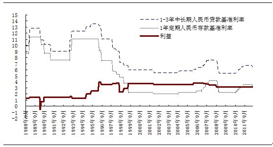 除手握巨量金融资源外,国内银行还受益于利率管制得以维持稳定而可观的利差,存贷利差迄今仍是银行最主要的利润来源。以1-3年期人民币中长期贷款基准利率和1年期定期存款基准利率测算,近10年来银行获得的存贷款利差始终保持在3%以上。