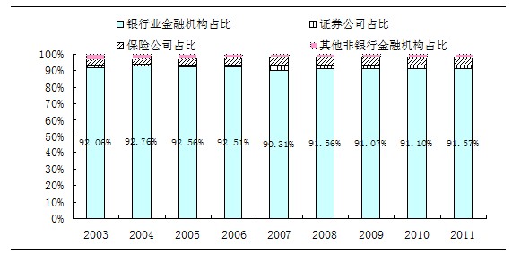受大一统的传统金融体制及其惯性的影响,银行体系汇集了绝大多数的金融资源,进入21世纪后银行业金融机构在国内金融机构总资产中的占比仍然保持在90%以上。